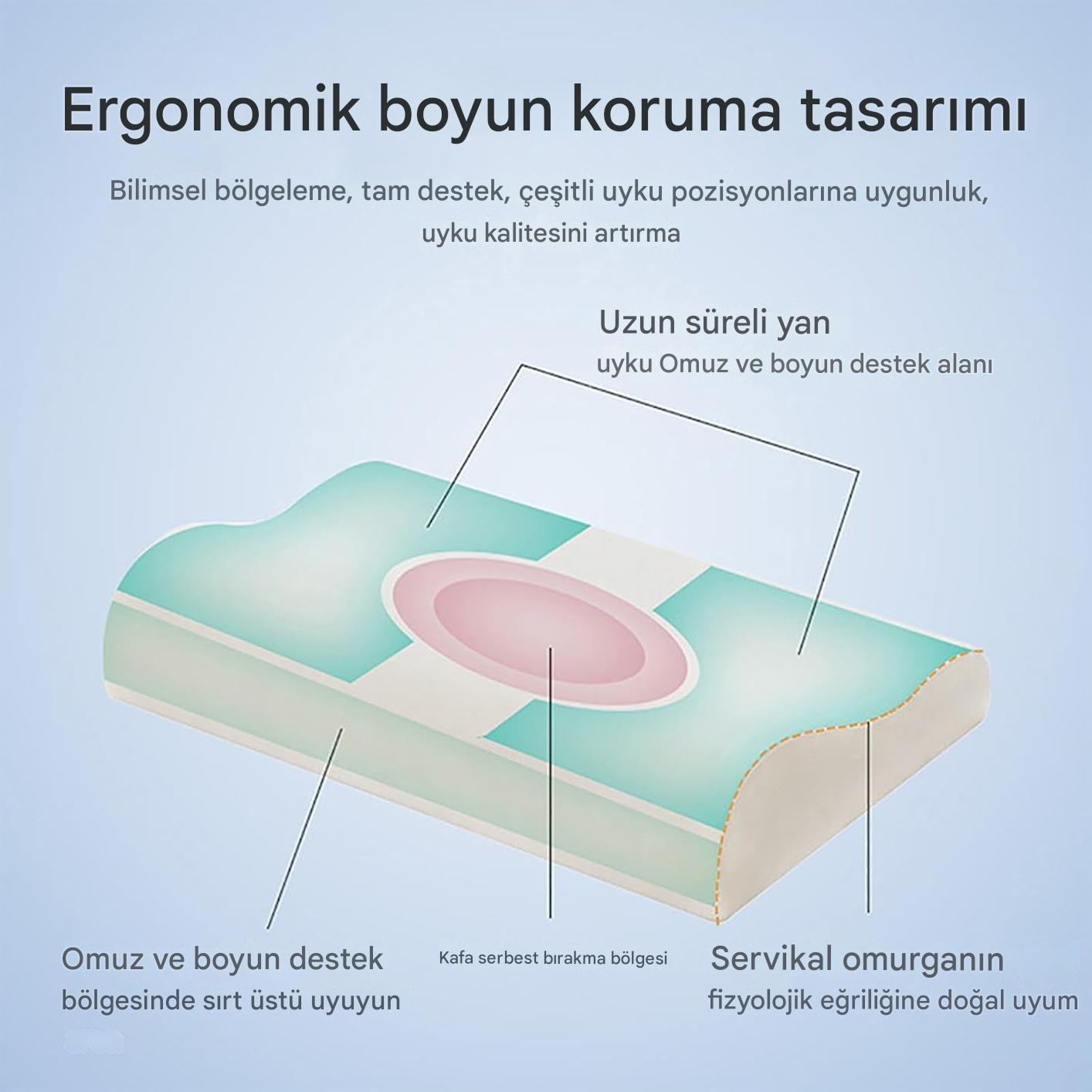 Bilimsel tasarımıyla boyun ve omuz bölgesine tam destek sağlar. Servikal omurga eğriliğine doğal uyum göstererek doğru duruşu destekler. Yan veya sırt üstü uyku pozisyonlarında rahatlık sunar, uyku kalitesini artırır.